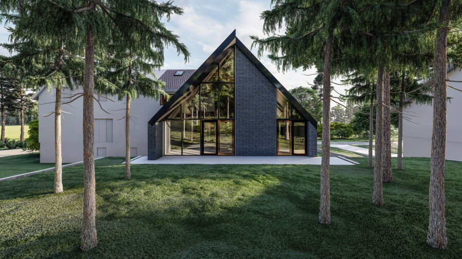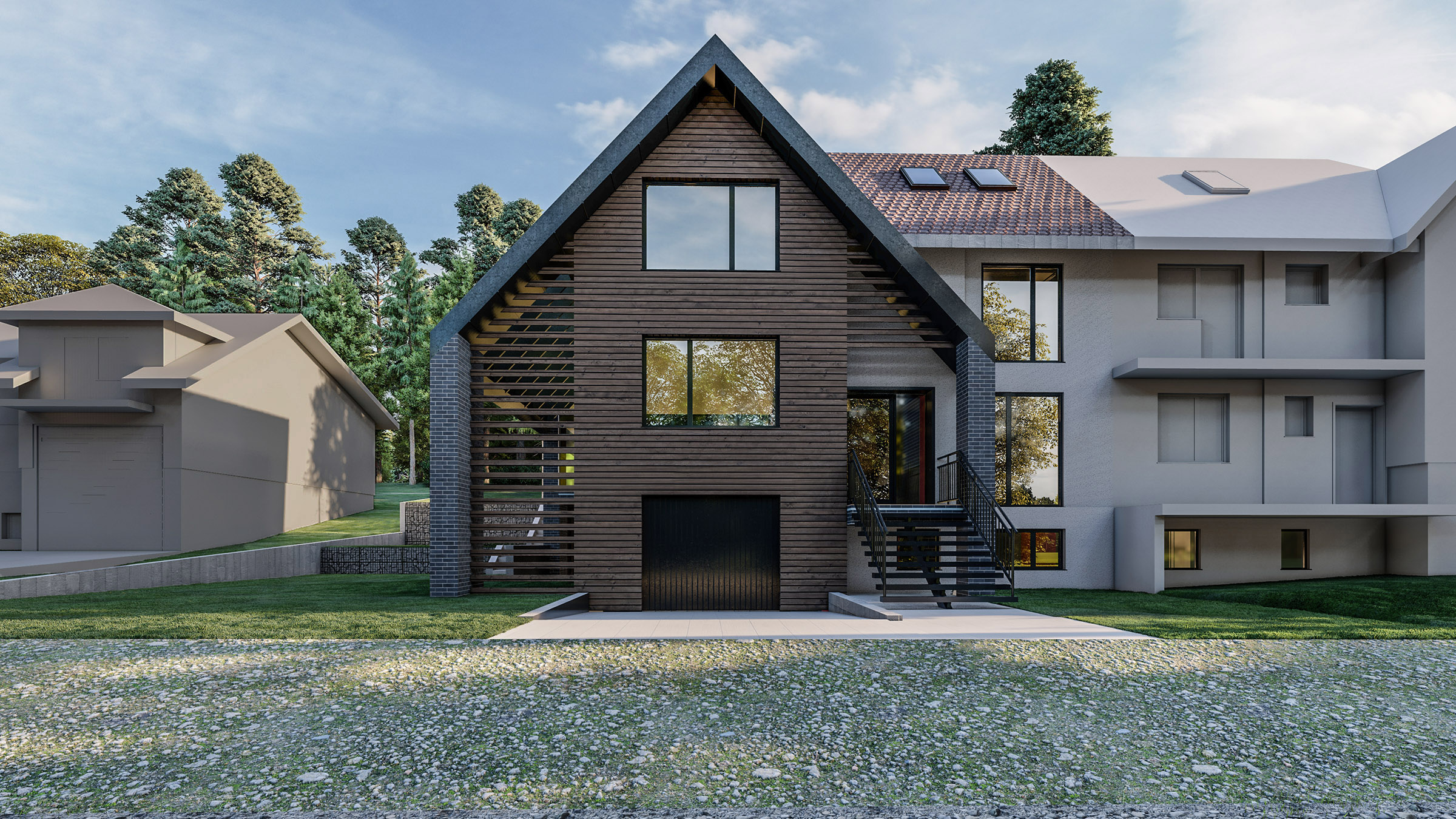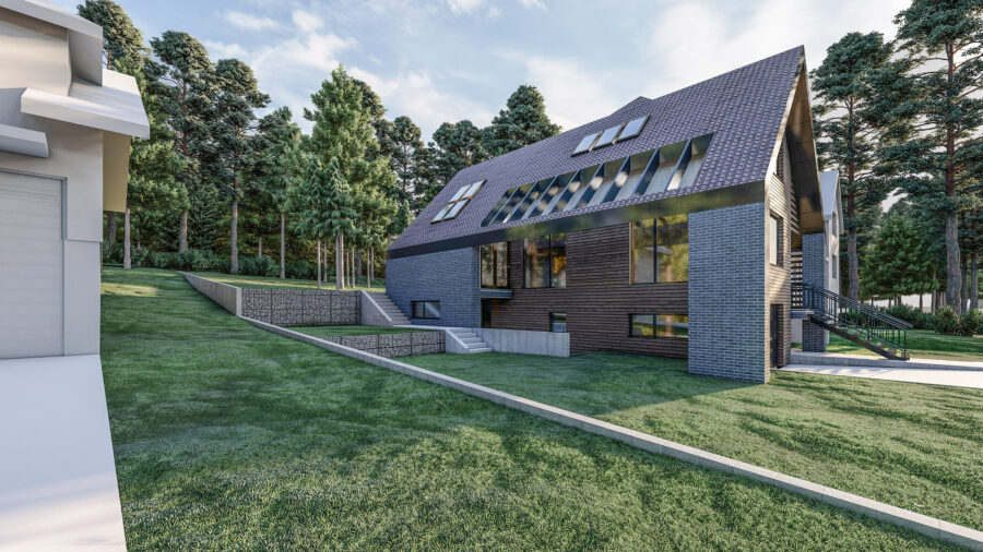 Istniejący budynek został wyremontowany z zachowaniem jego wysokości. Przebudowa budynku skupia się na zmianie układu funkcjonalnego wraz ze zmianą wielkości otworów okiennych. Powiększona została strefa wypoczynkowa oraz piwnica od północnej strony działki tj. ogrodu.