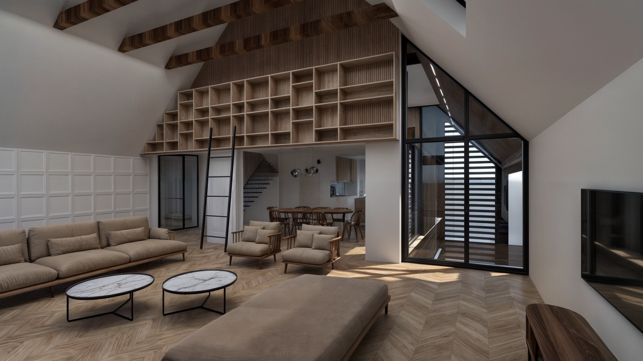 Charakterystycznym elementem projektu są industrialne przeszklenia ściany szczytowej od strony północnej działki tj. ogrodu. Wnętrza utrzymane są w jasnej, beżowo – szarej kolorystyce, zastosowane drewniane belki i podłogi podkreślają rustykalny klimat. Nowoczesny minimalizm zapewniają chłodne biele na ścianach, czerń metalu oraz szkło.