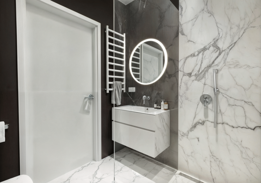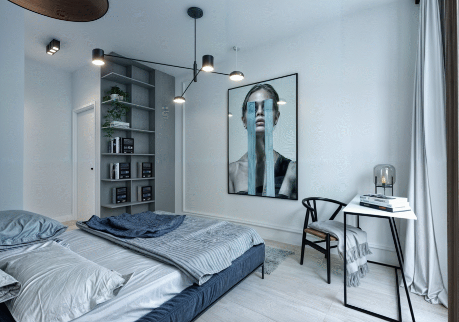 Charakterystycznym i praktycznym elementem aranżacji wnętrza są szafy w zabudowie, występujące w holu oraz obu sypialniach. Drzwi do jednej z sypialni to tzw. drzwi ukryte, są spójne kolorystycznie ze ścianą.