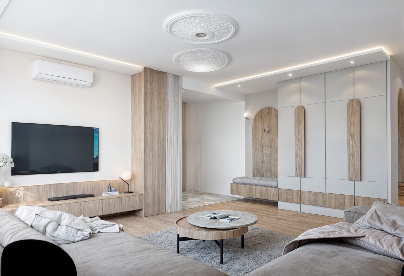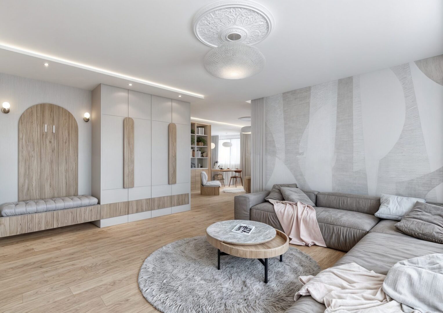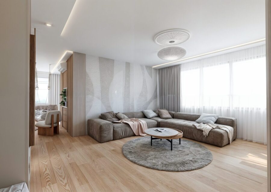 Projekt wnętrza apartamentu na ostatniej kondygnacji o podwyższonym standardzie. Sześcio-pokojowy apartament z kuchnią otwartą na część dzienną, zaprojektowany został w jasnej, beżowo – białej kolorystyce z elementami drewnianymi w nurcie japandi. Harmonijną i przytulną przestrzeń dopełnia oświetlenie.