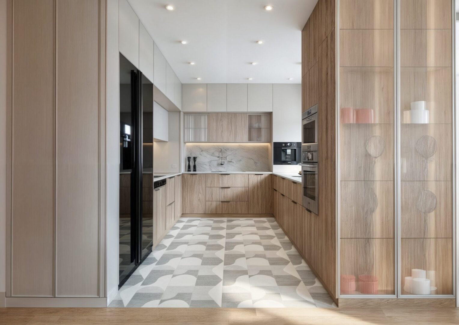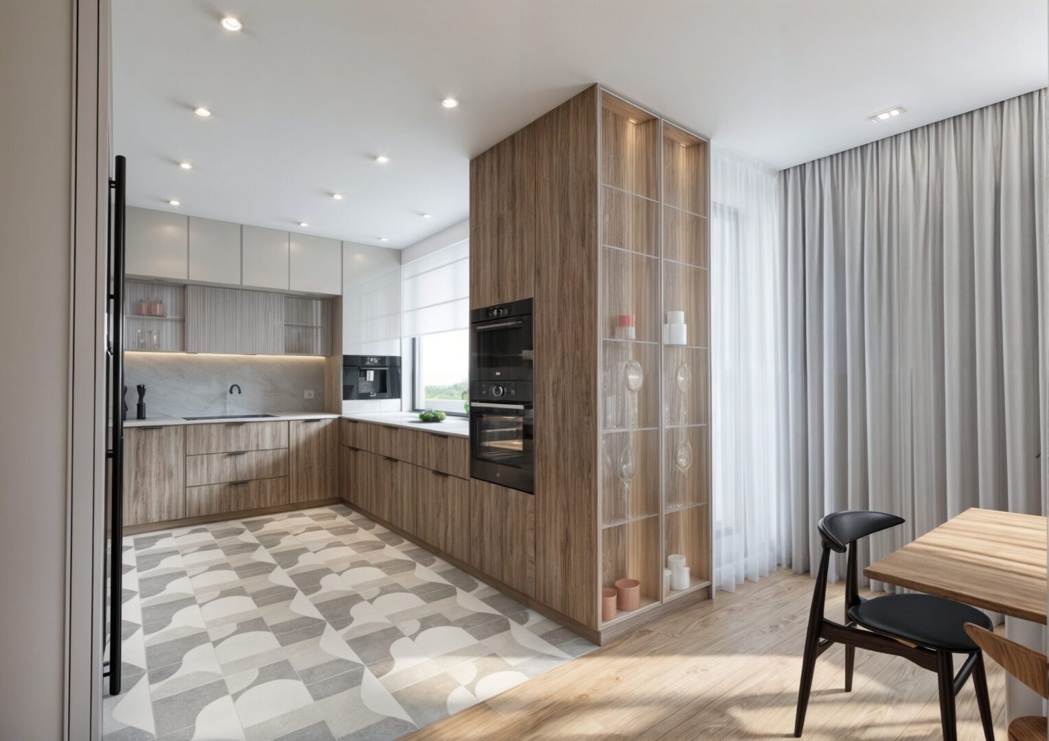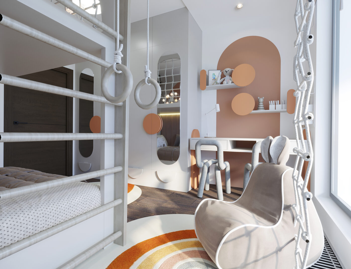 Projekt wnętrza apartamentu na ostatniej kondygnacji o podwyższonym standardzie. Sześcio-pokojowy apartament z kuchnią otwartą na część dzienną, zaprojektowany został w jasnej, beżowo – białej kolorystyce z elementami drewnianymi w nurcie japandi. Harmonijną i przytulną przestrzeń dopełnia oświetlenie.
